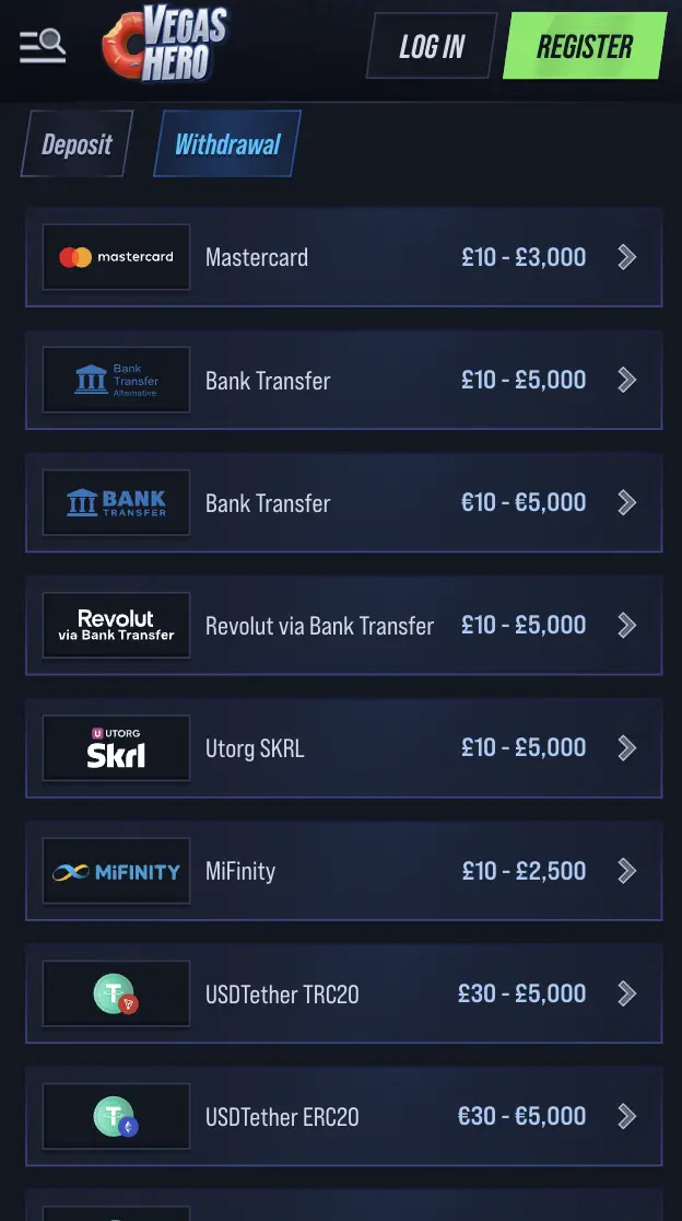 VegasHero Withdrawal Methods